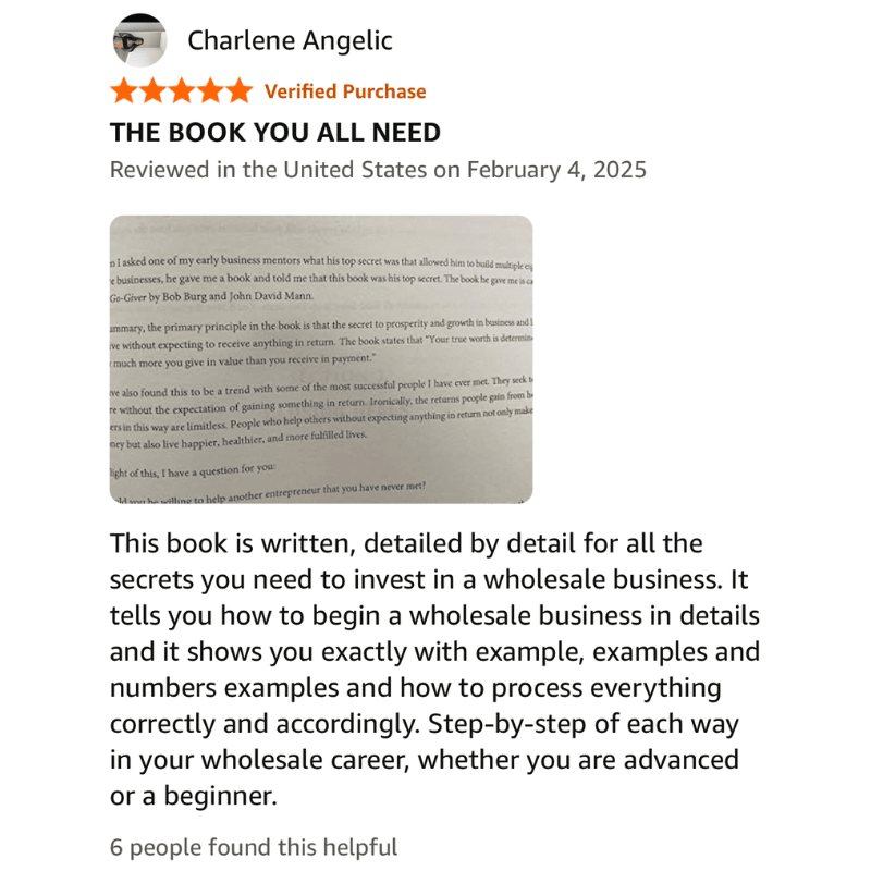 4 sections & 250 pages packed with easy to follow chapters, you'll get the A to Z blueprint for scaling your wholesaling business.
